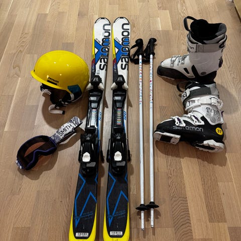 Lasten laskettelusettinä laskettelusukset ja niihin sopivat laskettelumonot. Sukset 130cm pitkät ja monot ehkä 34-35. Pohjallinen 22cm. Pohjat kaipaa voitelua mut ok kuntoiset lapselle.