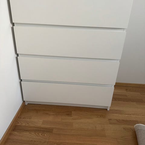 Vuoden vanha valkoinen lipasto kahdeksalla laatikolla. Myydään muuton alta pois. Kolmessa laatikossa pohjalevyssä kosmetiikan aiheuttamia laikkuja. Näkyvät kuvissa.