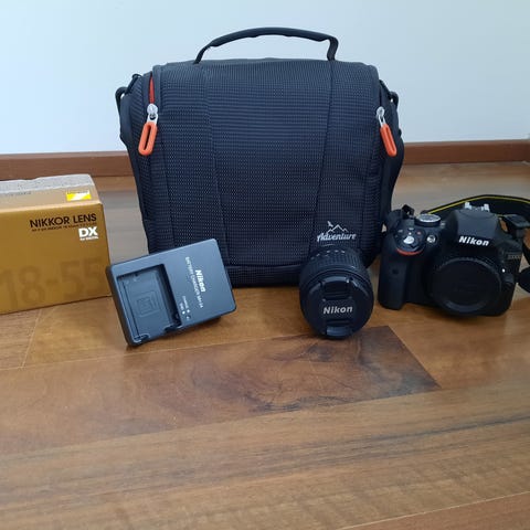 Nikon D3200 + Nikon AF-S DX NIKKOR 18-55mm f/3.5-5.6G ED II + tarvikkeet