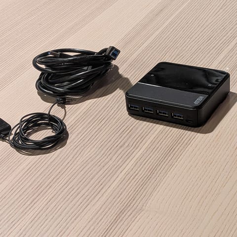 Perushyvä usb-hubi joka kiinnittyy magneettisesti vaikkapa tietokoneen keskusyksikön kylkeen. Mukana usb-johto.