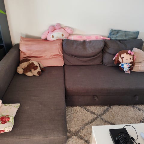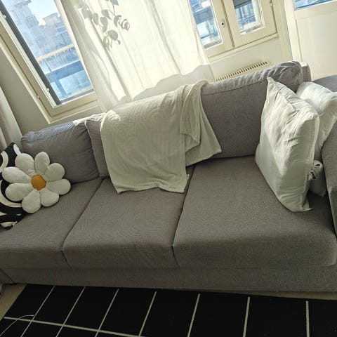 Annetaan ensimmäiselle hakijalle hyväkuntoinen Ikea Vimle-sohva. (Koristetyynyt eivät tule mukaan).