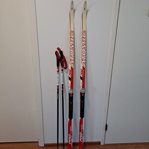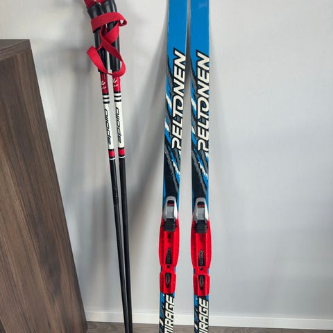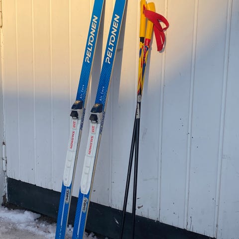 Peltosen sukset (147cm) Atomicin NNN-siteillä ja Apollon sauvat (110cm). Toisen suksen kärjessä lohkeama, ei vaikuta hiihtoon (näkyy kuvassa).
