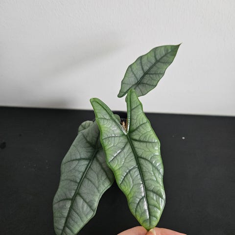 Mukulasta kasvatettu taimi. Isoimman lehden pituus noin 6,5cm (kuva).