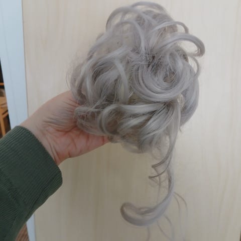 Harmaa hiuslisäke. Tuote koostuu muovisesta hiusklipsistä, johon on kiinnitetty synteettinen, harmaa kihara hiusosa. Sopii käytettäväksi kampauksen tuuhentamiseen tai ponnarin ja nutturan lisänä.