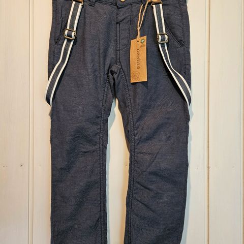 Newbie poikien housut. Väri tumman sininen. Housuissa henkselit, jotka saa myös pois helposti. Koko 116/122.