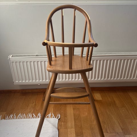 Käytetty puinen, pöydäksi ja tuoliksi taittuva, syöttötuoli irrallisella pehmusteella. Siistikuntoinen.