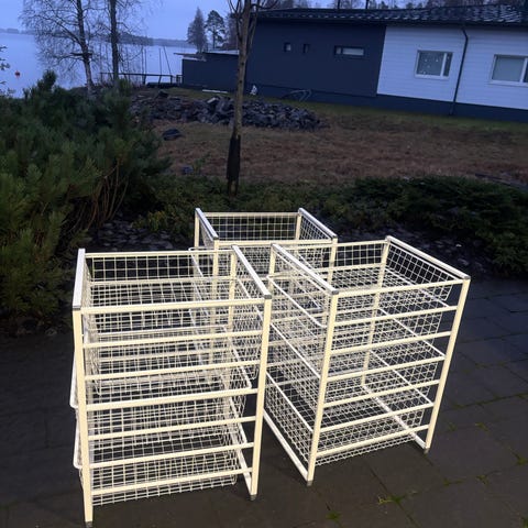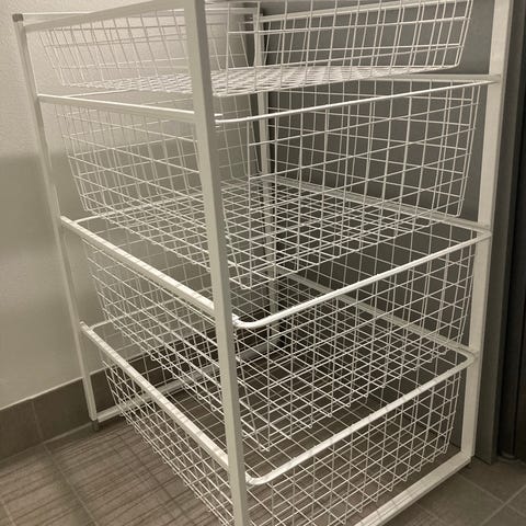 Myydään Elfa Basic säilytysjärjestelmä koreilla.