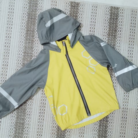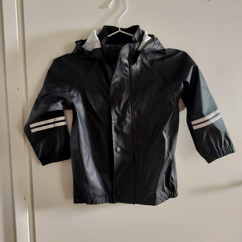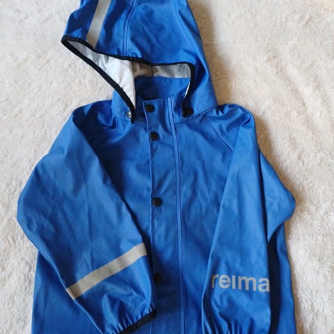 Turkoosi HC sadetakki koko 98cm, heijastin nauhat irronneet takaa pinnasta, muutoin hyvä käytetty kunto.