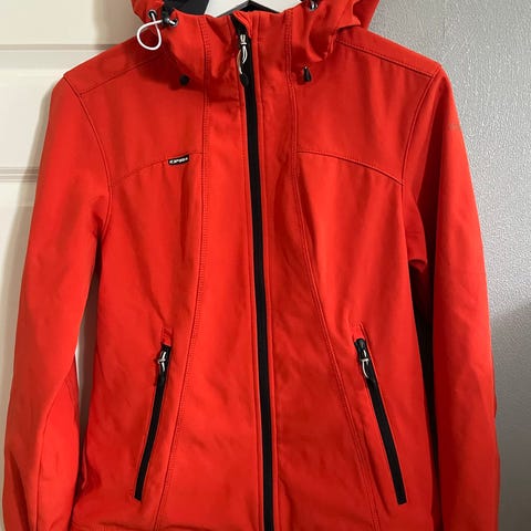Naisten Icepeak -softshelltakki 38. Paljon taskuja, myös hihatasku. Kiristys helmassa ja hupussa. Hihoissa tarrakiristys. Kainaloiden alla vetoketjulliset viilennysaukot.