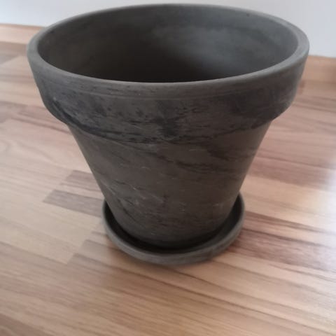 Ruskea ja harmaa saviruukku, reiät pohjassa+ kiinteät aluslautaset. Korkeus 14 cm, leveys 12 cm. Yhteensä 3€. Vain nouto Kuokkalasta.
