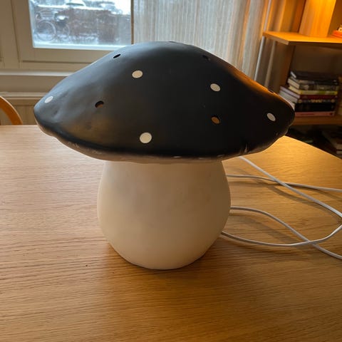 Myynnissä lähes käyttämätön lasinen sieni pötävalaisin. Valaisimen yhdessä reunassa on pienenpieni lommo. Lommo on tullut jo tehtaalla, koska se on lasitteen alla.