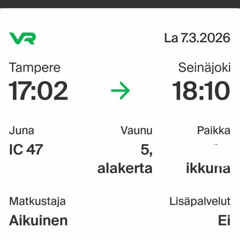 Myydään tarpeettomana junalippu Tampere-Seinäjoki.