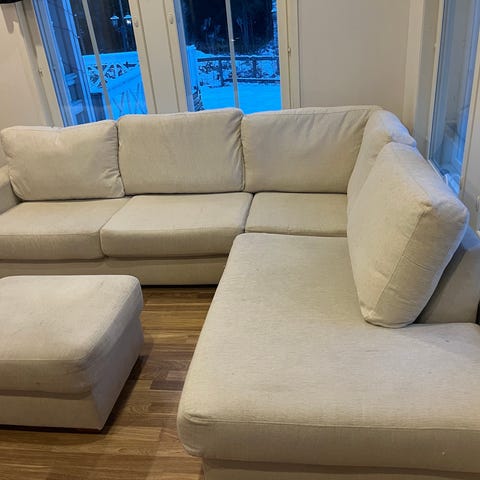 Myydään hyvänkuntoinen kulmasohva. Päälliset irroitettavat joten helppo pestä. Korkeat jalat eli helppo imuroida alta.