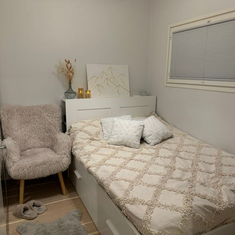 Hyväkuntoinen sängyn runko ja laatikot, ei merkittävää kulumaa. Pieniä naarmuja ym. Keskipalkki on rikki, tarvitsee uuden. Niitä saa Ikeasta 20€ (Skorva). Mukaan ei tule patjoja, sälepohjaa ym. Rikkonainen keskipalkki ei ole vahingoittanut runkoa.