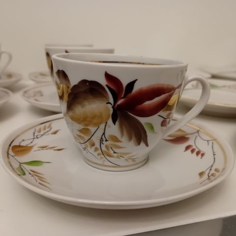Lomonosov " Talvi-ilta" kahvikupit, asetit ja pullalautaset, 5 kpl. Kupin korkeus 5,8 cm, suuaukon halkaisija 7,5 cm, asetin halkaisija 11,7 cm, pullalautasen halkaisija 15,6 cm. Jossain kultauksessa hieman kulumaa, ks. kuvat, kunto muuten hyvä. Nouto