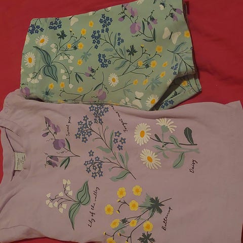 Pop mekko ja housut 3kpl. Uutena ostettu ja yhdellä pidetty, hyvä käytetty kunto. Turkooseissa ja keltaisissa housuissa pienet rasvatahrat, ei ole yritetty tahranpoistoa.