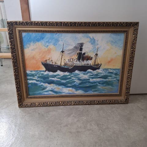 Meri-aiheinen taulu, jossa kuvattuna höyrylaiva avomerellä pilvisellä taivaalla. Teos on kehystetty näyttäviin, koristeellisiin kultakehyksiin, joissa on kohokuvioituja yksityiskohtia. Sopii seinäkoristeeksi esimerkiksi olohuoneeseen, työhuoneeseen tai muuhun sisätilaan. Materiaali vaikuttaa olevan maalaus kankaalle tai levylle, tarkempi tekniikka ei käy ilmi kuvista.