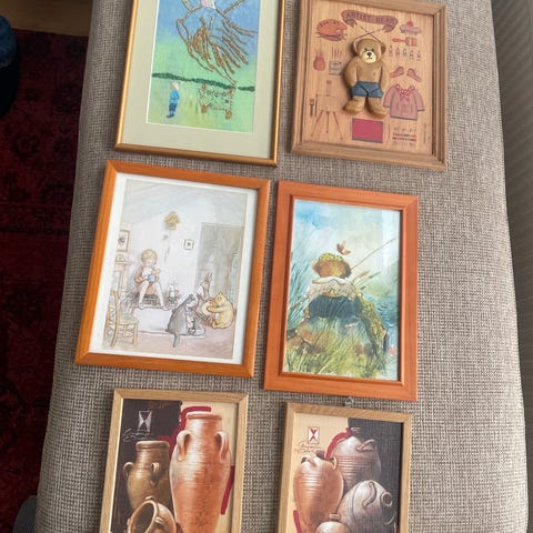 Taulupari, jossa kaksi kehystettyä kuvaa. Molemmissa tauluissa on harmaa puukehys ja vaalea paspis. Toisessa kuvassa on musta kissa ja toisessa enkeli- tai keijuhahmo kukka- ja kasviaiheisessa ympäristössä. Sopii esimerkiksi olohuoneen tai makuuhuoneen seinäkoristeeksi. Myydään yhdessä parina.