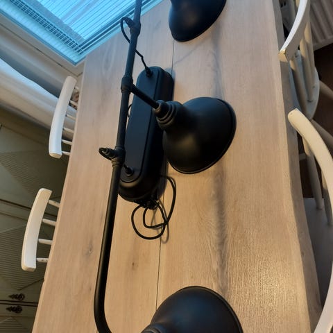 IKEA kattovalaisin, jossa musta metallinen varjostin ja valkoinen sisäpinta. Valaisimessa on kangaspäällysteinen, mustavalkoinen johto ja kattokuppi kiinnitystä varten. Sopii yleisvalaisimeksi esimerkiksi keittiöön, olohuoneeseen tai ruokapöydän yläpuolelle.