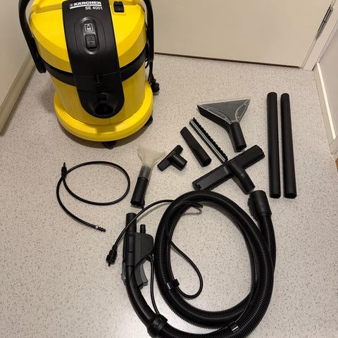 Kärcher SE 6.100 tekstiilipesuri. Laite on tarkoitettu tekstiilipintojen, kuten mattojen, sohvien ja auton istuimien syväpuhdistukseen ruiskutus- ja imutoiminnolla. Mukana on letku ja suutin, jotka soveltuvat erilaisten pintojen puhdistamiseen. Soveltuu kotitalouskäyttöön kovan lian ja tahrakohtien poistoon tekstiileistä.