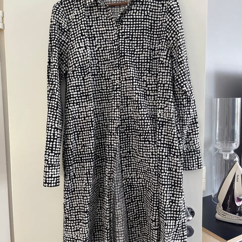 Marimekko Lara naisten mekko, koko 42. Mekossa on mustavalkoinen graafinen kuosi ja pitkät hihat. Materiaali on puuvillasekoitetta (pääosin puuvillaa, lisäksi polyamidia ja elastaania), joka tekee kankaasta joustavan ja miellyttävän käyttää. Malli on suoralinjainen ja polvipituinen tai hieman sen alapuolelle ulottuva. Sopii arki- ja työvaatteeksi tai rennoksi juhla-asuksi. Naisten vaate.