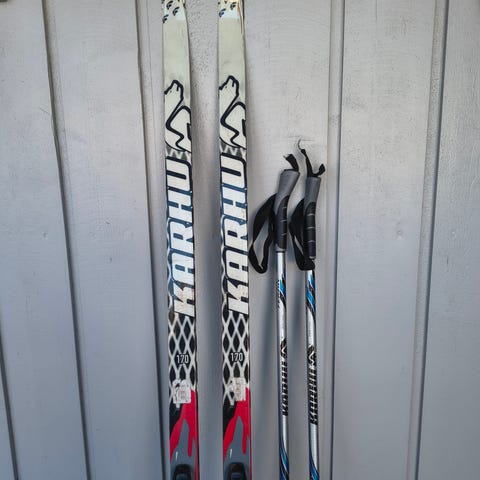 Atomic 170cm ja Peltonen 160cm suksiparit, sauvat Salomon 110cm ja Swiz 115cn