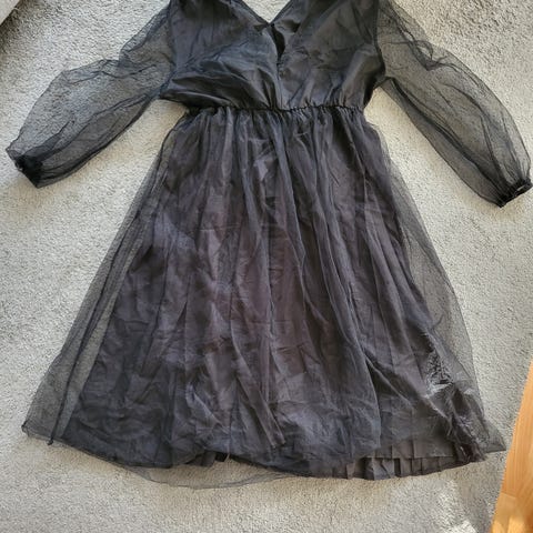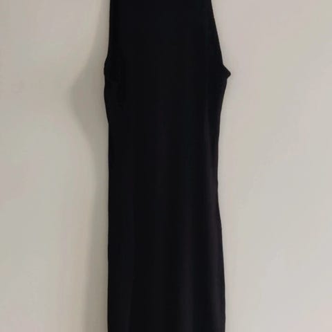 Naisten hihaton mekko, koko L. Väri musta. Materiaali joustavaapuuvillaa. Mekossa on laskosyläosa ja hieman levenevä helma, jossa on läpikuultava reunuskerros. Takana vetoketju pukemista helpottamassa.