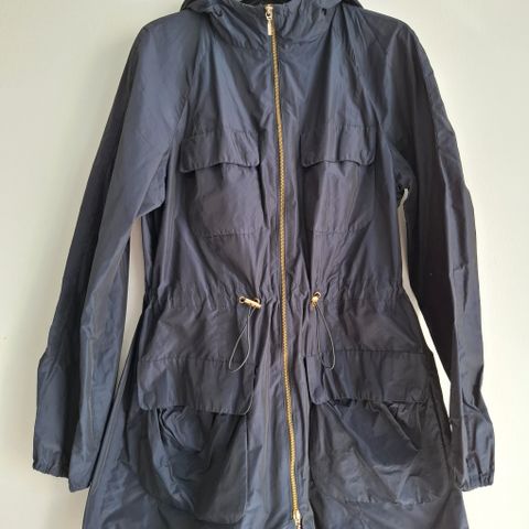 Retronmallinen, helmaan levenevä vettähylkivä siistikuntoinen ohut takki. Tummansininen. Vetoketju ja nappilista edessä, kaunis leikkaus selässä, taskut.