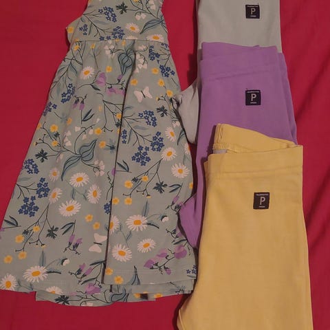 Pop mekko ja housut 2kpl, koko 92. Hyvä käytetty kunto. Tummemmissa housuissa pieni rasvatahra, ei ole yritetty tahranpoistoa.