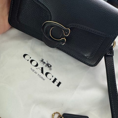 Coachin musta nahkalaukku. Ihana pilkullinen sisäkangas. Ostettu 2000-luvulla. Laukku on erinomaisessa kunnossa, mutta sisäkankaaseen on tullut joitain tahroja. Hopeiset yksityiskohdat.