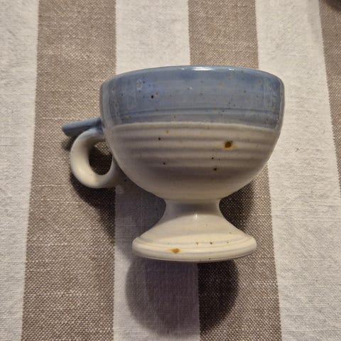 Sininen muki, jonka alkuperästä ei tietoa. Pohjassa mahdollisesti lukee ”elämän savi finland” - viimeisessä kuvassa pohjassa oleva teksti.