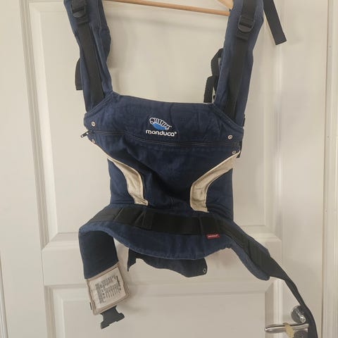 Manbuca kantoreppu, väri punainen vaaleilla yksityiskohdilla. Säädettävät olka- ja vyötäröhihnat, kiinnitys soljilla. Soveltuu vauvan ja pienen lapsen kantamiseen edessä. Materiaali todennäköisesti tekstiiliä, pehmustetut osat tuovat tukea kantajalle ja lapselle.