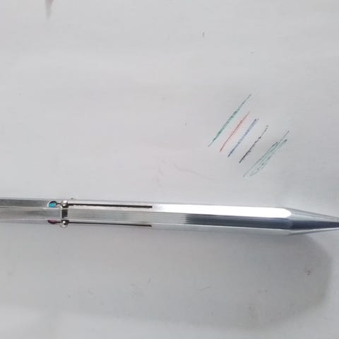 Hopeanvärinen nelivärikuulakärkikynä, jossa on painikkeet eri väreille. Vintage. Keräily.