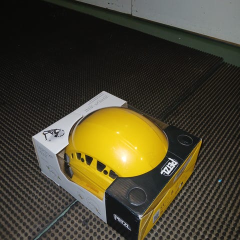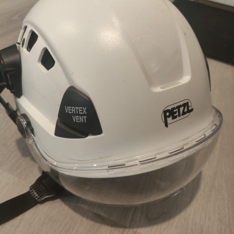 Petzl suojakypärä sininen kuulosuojaimilla. Kypärässä on säädettävät leukahihnat ja sisävaljaat istuvuuden säätöön. Sivuille on kiinnitetty Sordin KKC -kuulosuojaimet, jotka voidaan kääntää ylös ja alas käytön mukaan. Jäänyt ylimääräiseks vähän käytön vuoksi.