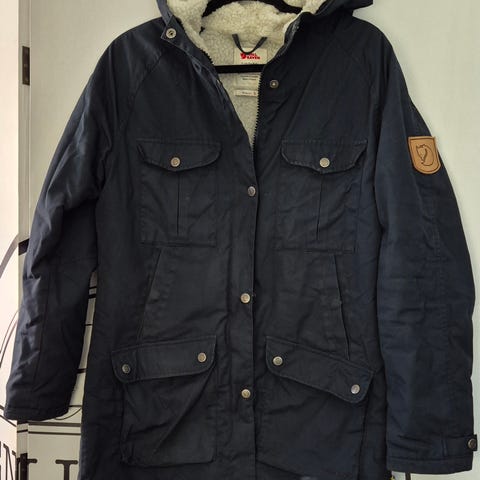 Fjellun parkatakki tikkivuorilla. Paljon taskuja sisäpuolella ja ulkopuolella. Kaikki vetoketjut ja nepparit hyvässä kunnossa ja toimivat moitteettomasti. Väri varsinkin saumakohdissa haalistunut ja kaipaa vahausta. Kangas kauttaaltaan ehjä.