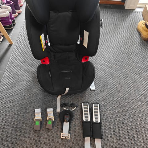 Britax Römer multi-tech III turvaistuin. Istuimessa on viisipistevaljaat, sivusuojat ja säädettävät olkavyöt. Päällinen on punainen ja musta. Selkäpuolella on vyöreittejä ja kiinnityspisteitä auton turvavöihin. Mukana tulee erillisiä vöitä ja käyttöohjeita kuvien mukaisesti. Voidaan käyttää selkä menosuuntaan ja päinvastoin. Sopii lapsille, jotka mahtuvat kokoluokkaan 9-25 kg asti. Ostettu uutena ja on meillä ollut käytössä 2 lapsella. Koiratalous.