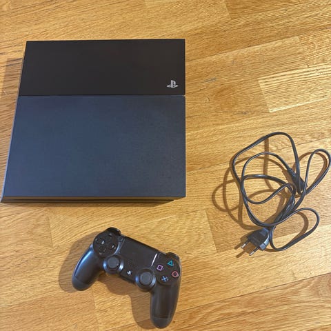Sony PlayStation 4 pelikonsoli musta (408.5Gt). Mukaan kaksi DualShock 4 ohjainta, musta ja kullanvärinen sekä alkuperäinen virtajohto.