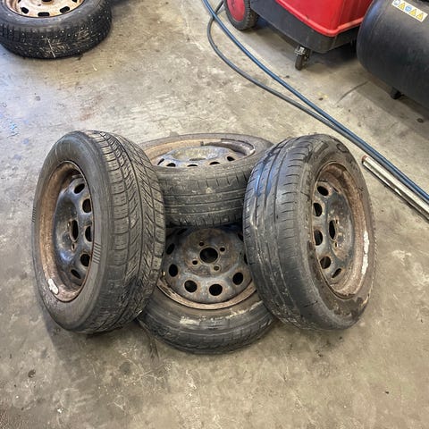 4x100 jaolla olevat 16" vanteet nastarenkailla. Vanteet karun näköiset kun lakka/maali hilseillyt irti paikoin. Renkaat kokoa 205/55R16 ja niissä pintaa ja nastat aika hyvin tallella mutta kumit vanhat.