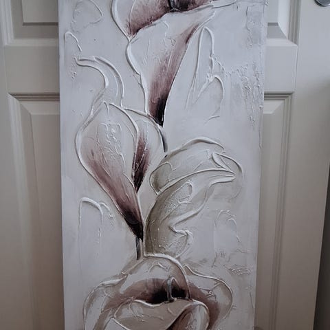 Taulu, jossa on asetelma kukkia, maljakoita ja omena lämpimän sävyisessä taustassa. Maalaus on signeerattu ja siinä on kultasävyiset kehykset. Takana on ripustuslanka seinälle kiinnittämistä varten. Sopii sisustuselementiksi esimerkiksi olohuoneeseen tai muuhun asuintilaan.