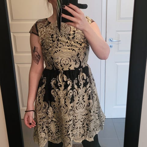 Hyväkuntoinen mekko, jossa musta pohja läpikuultavaa mesh- tai tyllimateriaalia, jonka päällä kullanvärinen koristekuviointi.