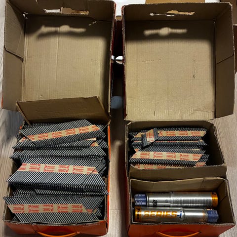 Pintos nauloja laatikossa. Metallisia rakennusnauloja yleiskäyttöön puu- ja rakennustöissä. Laatikko on avattu ja osittain rikkoontunut, nauloja useita kappaleita eri pituuksissa kuvien mukaisesti.