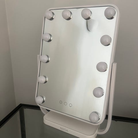 Neliönmuotoinen meikkipeili integroiduilla valaisimilla. Peilin molemmilla sivuilla on useita pyöreitä lamppuja, jotka antavat tasaisen valaistuksen kasvoille. Kehys on vaalea ja peili on tarkoitettu sisäkäyttöön, esimerkiksi meikkaustilaan. Sähköjohto tulee peilistä, ja peili voidaan sijoittaa seinää vasten tai kiinnittää seinälle rakenteesta riippuen.