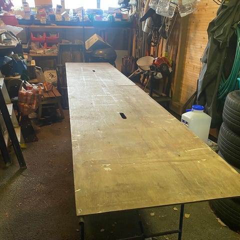 Myynnissä kokoontaitettava tapetointipöytä 300x60. Pinnassa näkyy käytön jälkiä, muuten siisti.