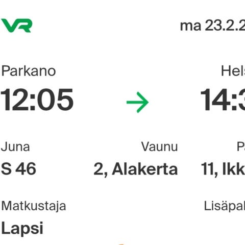 Vaasa-Helsinki junalippu 23.2