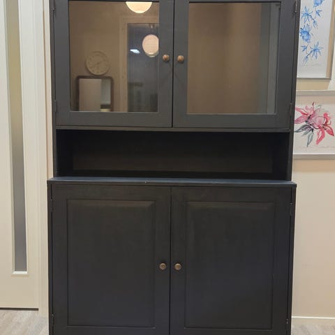 Lakattu mäntyvitriini. Ajan kauniisti patinoima väri. 5 hyllyä ja 2 laatikkoa. ( kuvassa olevat astiat ei kuulu kauppaan