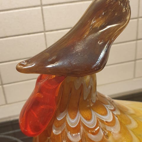 Hyväkuntoinen ja siisti kookas lasilintu, pituus pyrstön päästä nokan päähän n. 42 cm, korkeutta max. 24 cm. Signeeraus Keijo Kortesalo -07.