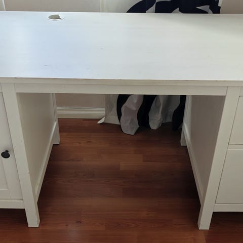 Siisti pöytä hyllyköllä.