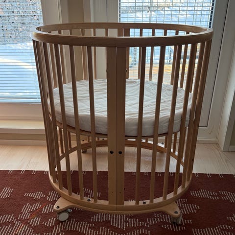 Stokke pinnasänky, ovaalin muotoinen puinen lastensänky. Sängyssä on pystypinnat ja se on varustettu patjalla. Kuvissa näkyy lisäksi Done by Deer -merkkinen vaaleanvihreä, mustapilkullinen reunapehmuste, joka kiertää sängyn sisäreunaa. Sopii vauvan ja pienen lapsen nukkumiseen lastenhuoneessa.