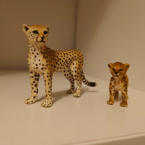 Schleich eläinfiguurit, joissa gepardi ja gepardinpentu.