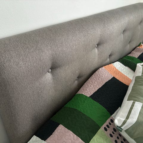 Harmaa, moderni ja siistikuntoinen verhoiltu sängynpääty. Pehmeä ja ajaton malli, sopii monenlaiseen sisustukseen. Hyväkuntoinen.
